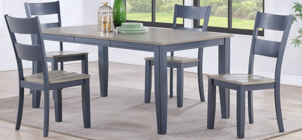 This two-tone gray and graphite coloration dining group features solid rubber wood and MDF. Chairs have solid hardwood frames with corner blocked legs and curved backs. Makes for a perfect space saver for any small space.Read More