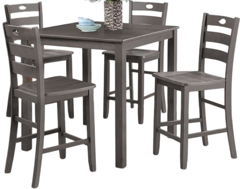 This 5-piece counter height dining set offers a comfortable space for meals and gatherings. It includes a square table and three matching stools, all finished in gray for a versatile look. Built for everyday use, it provides both durability and functionality in any dining area.Read More